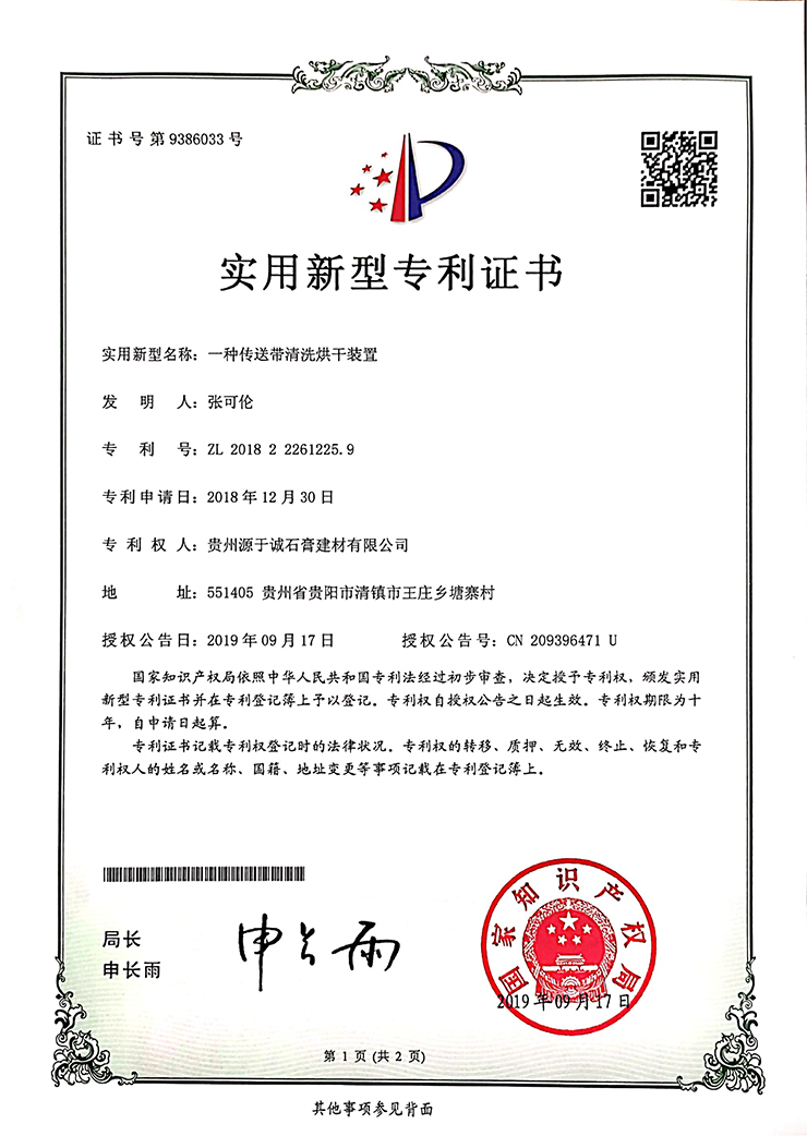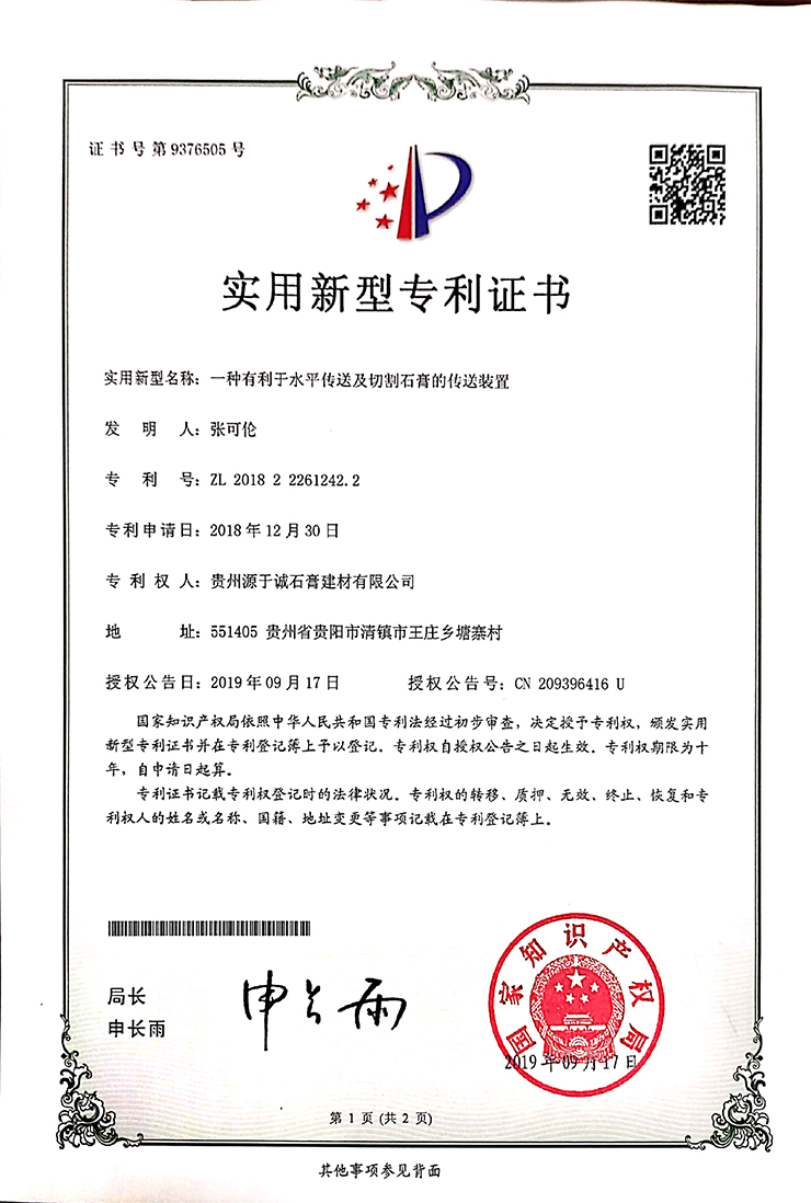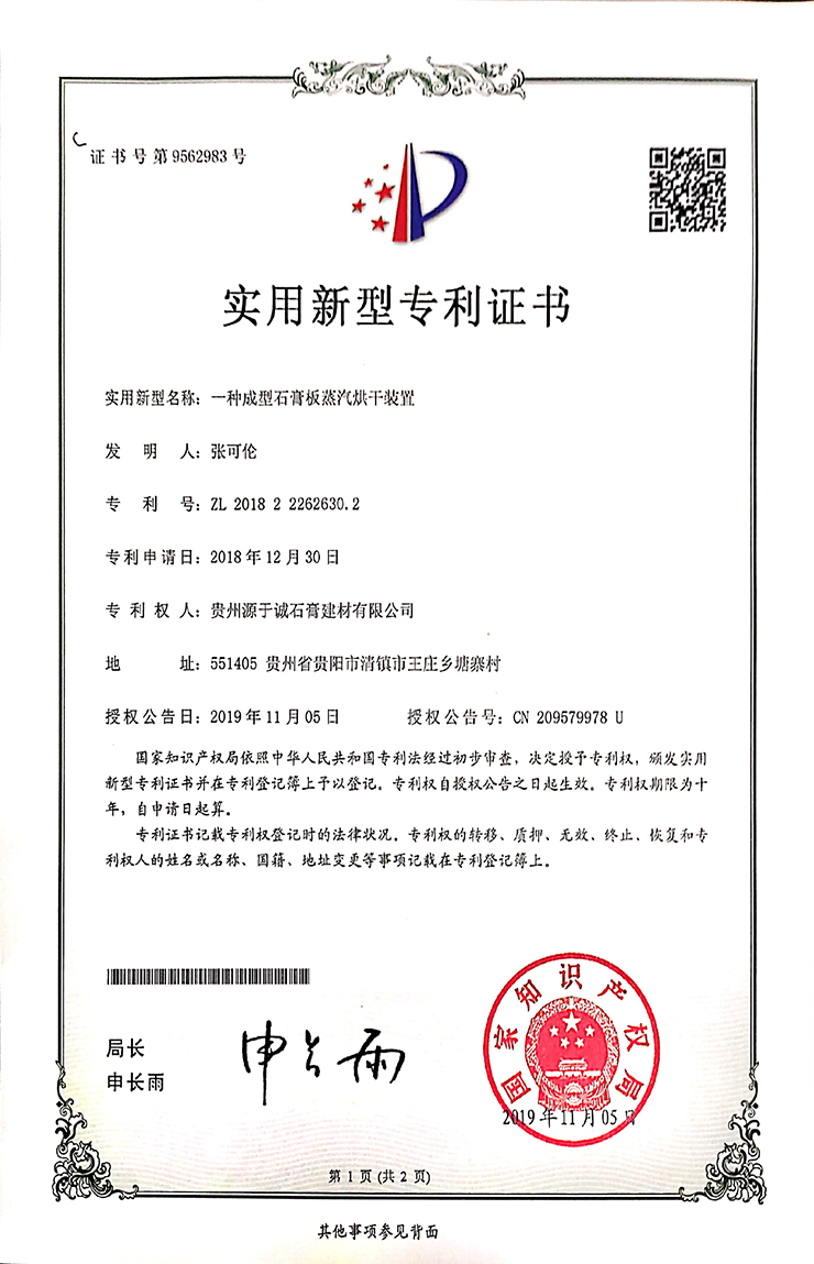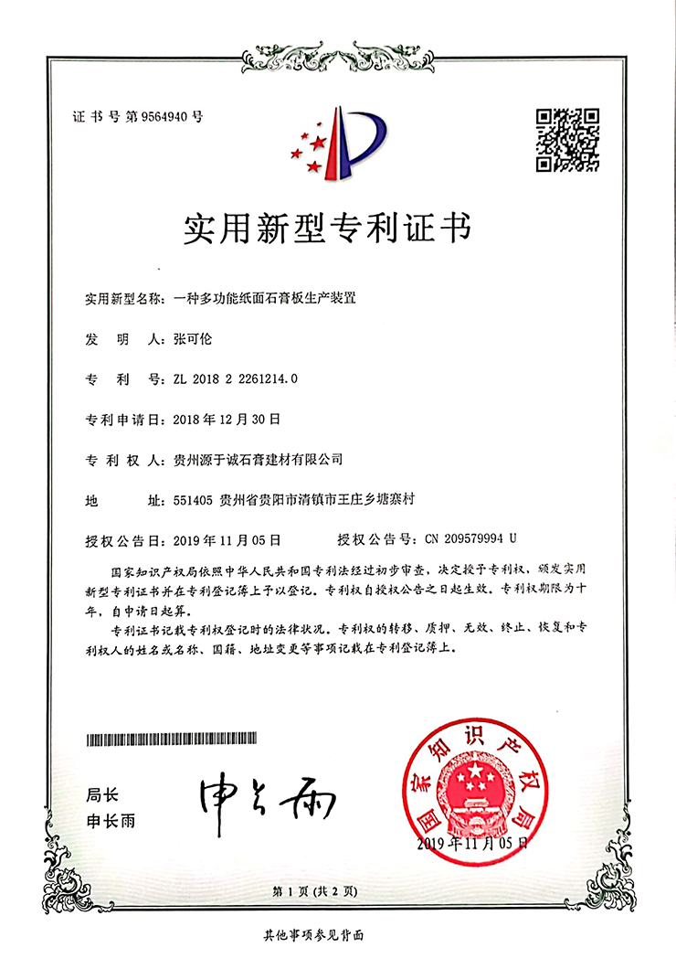 專利證書(一種多功能紙面石膏板生產(chǎn)裝置)