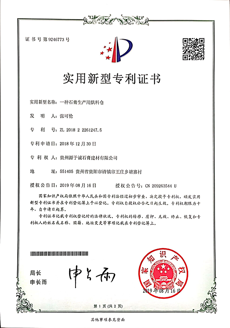 專利證書(一種石膏生產(chǎn)用烘料倉(cāng))